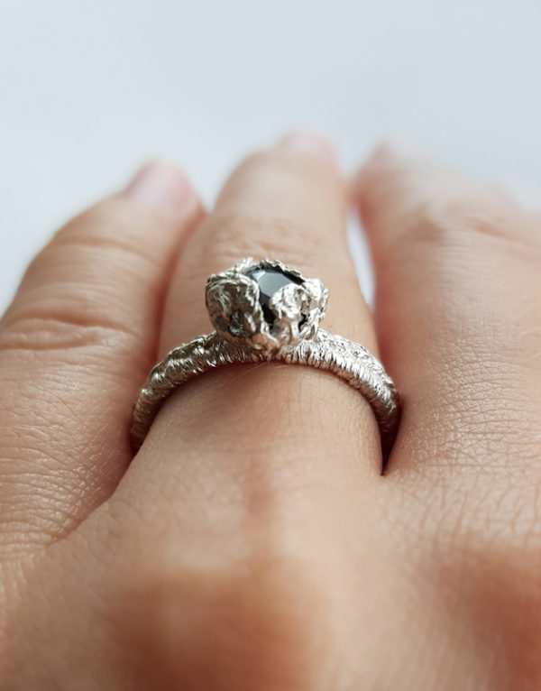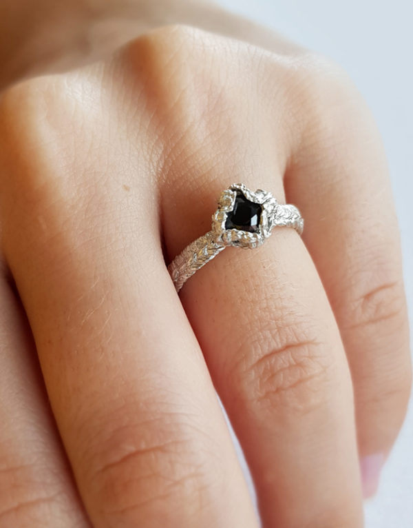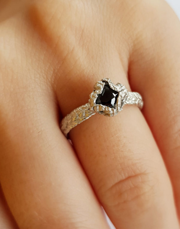 Unusual OOAK silver solitaire ring with black cubic zirconia. Handmade crochet with real thread and then turned to silver.