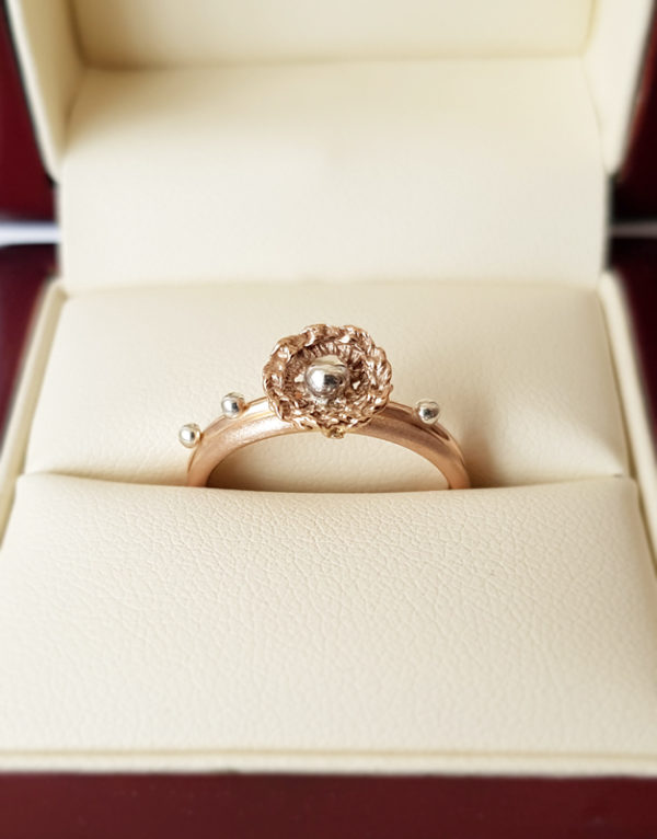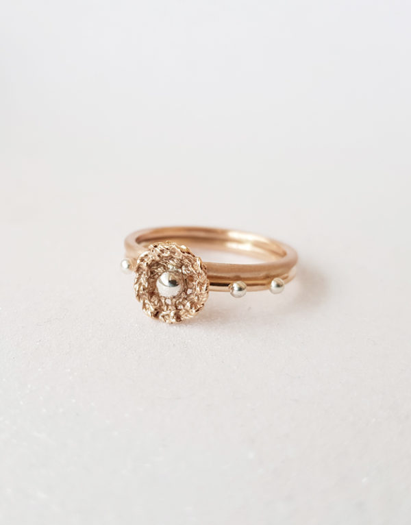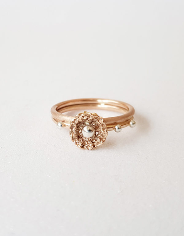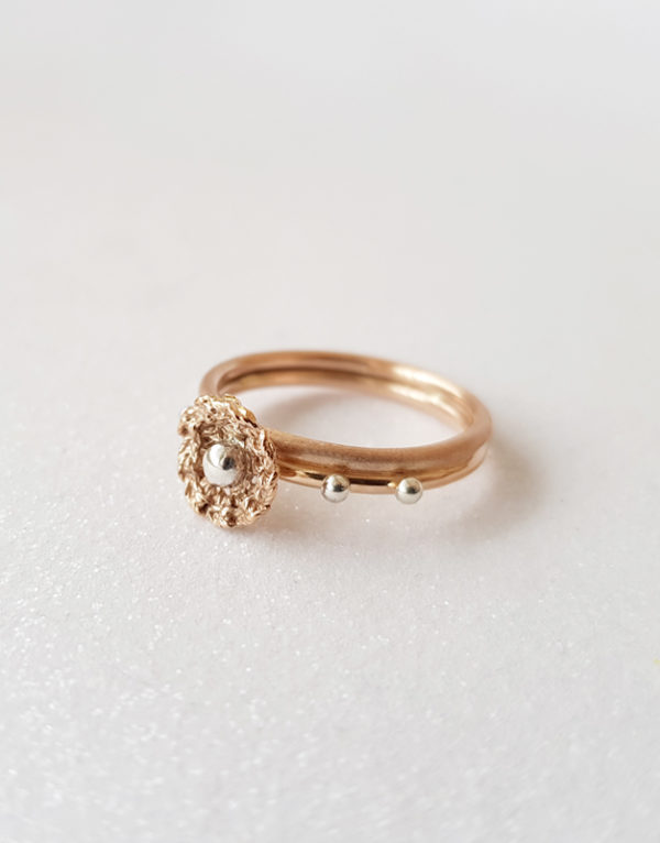 BESPOKE / GALLERYBeautiful & feminine rose gold ring with crochet flower and asymmetric silver bubbles.